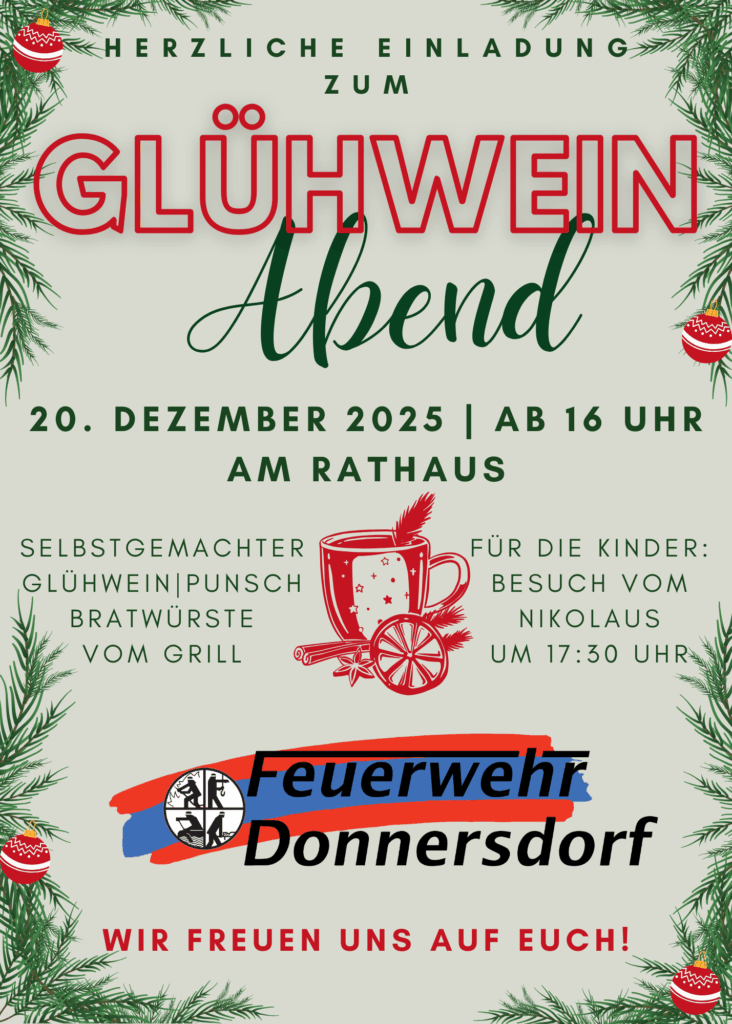 Wir veranstalten am 20. Dezember 2025 ab 16 Uhr wieder unseren gemütlichen Glühweinabend, neben dem großen Weihnachtsbaum, am Rathaus.