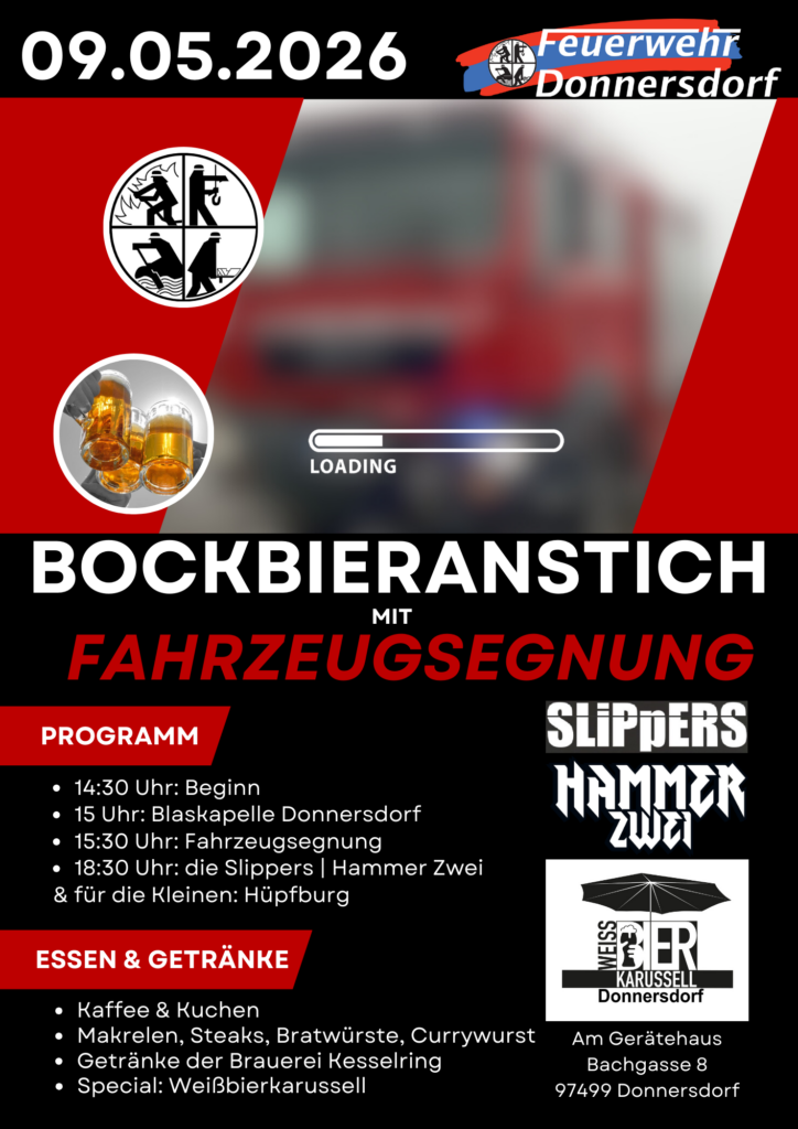 Unter dem Motto „Feuerwehr macht Bock!“ lädt die Feuerwehr Donnersdorf in diesem Jahr herzlich zum gemütlichen Bockbieranstich am Feuerwehrhaus ein. Ein besonderer Programmpunkt ist dabei die Segnung unseres neuen Löschfahrzeuges, die wir gemeinsam mit euch feiern möchten.